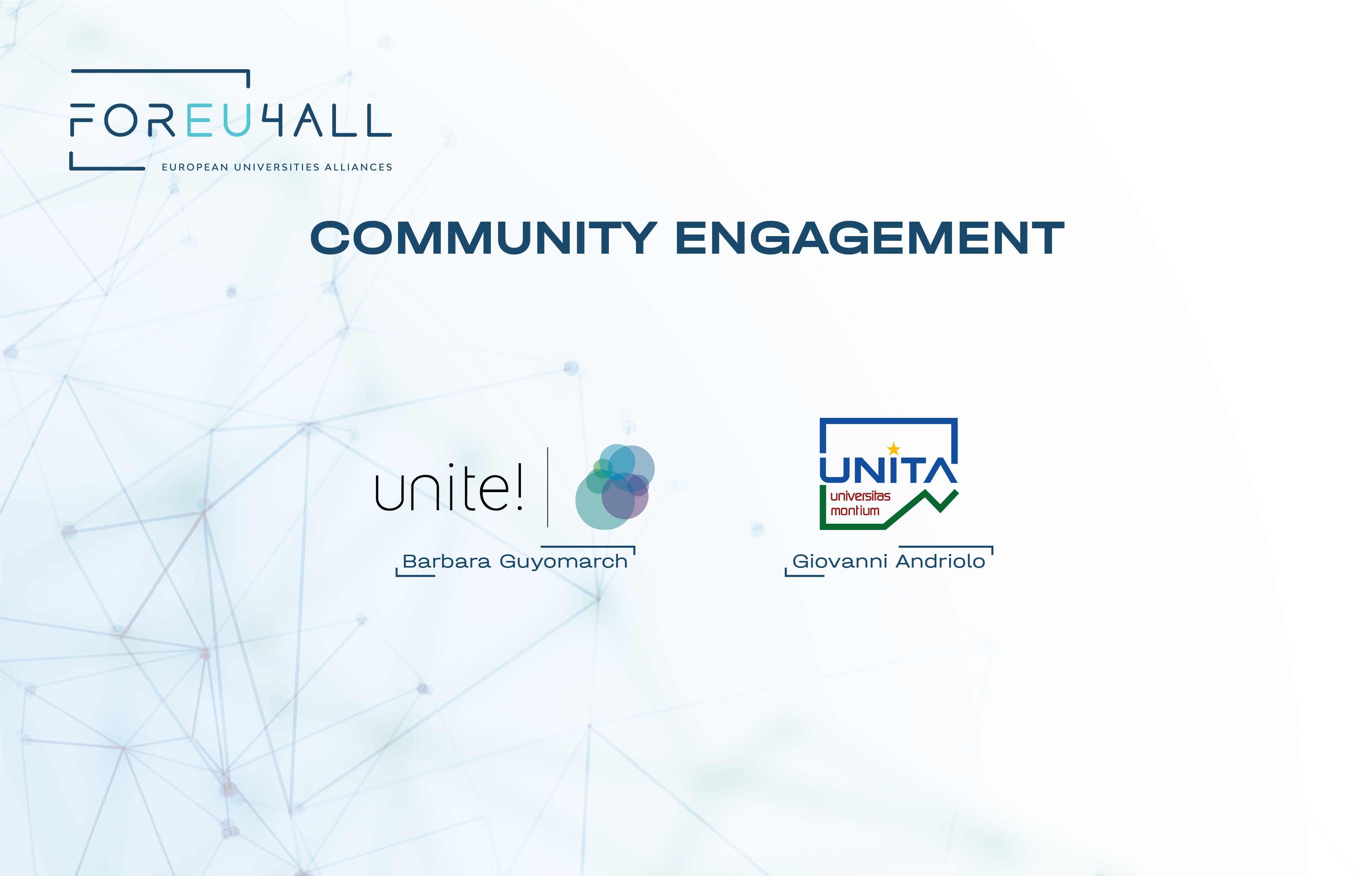 The Community Engagement topical group deals with enhancing and reinventing students and staff (i.e., academic and administrative) participation within the alliances, empowering them both as active co-creators and engaged beneficiaries.