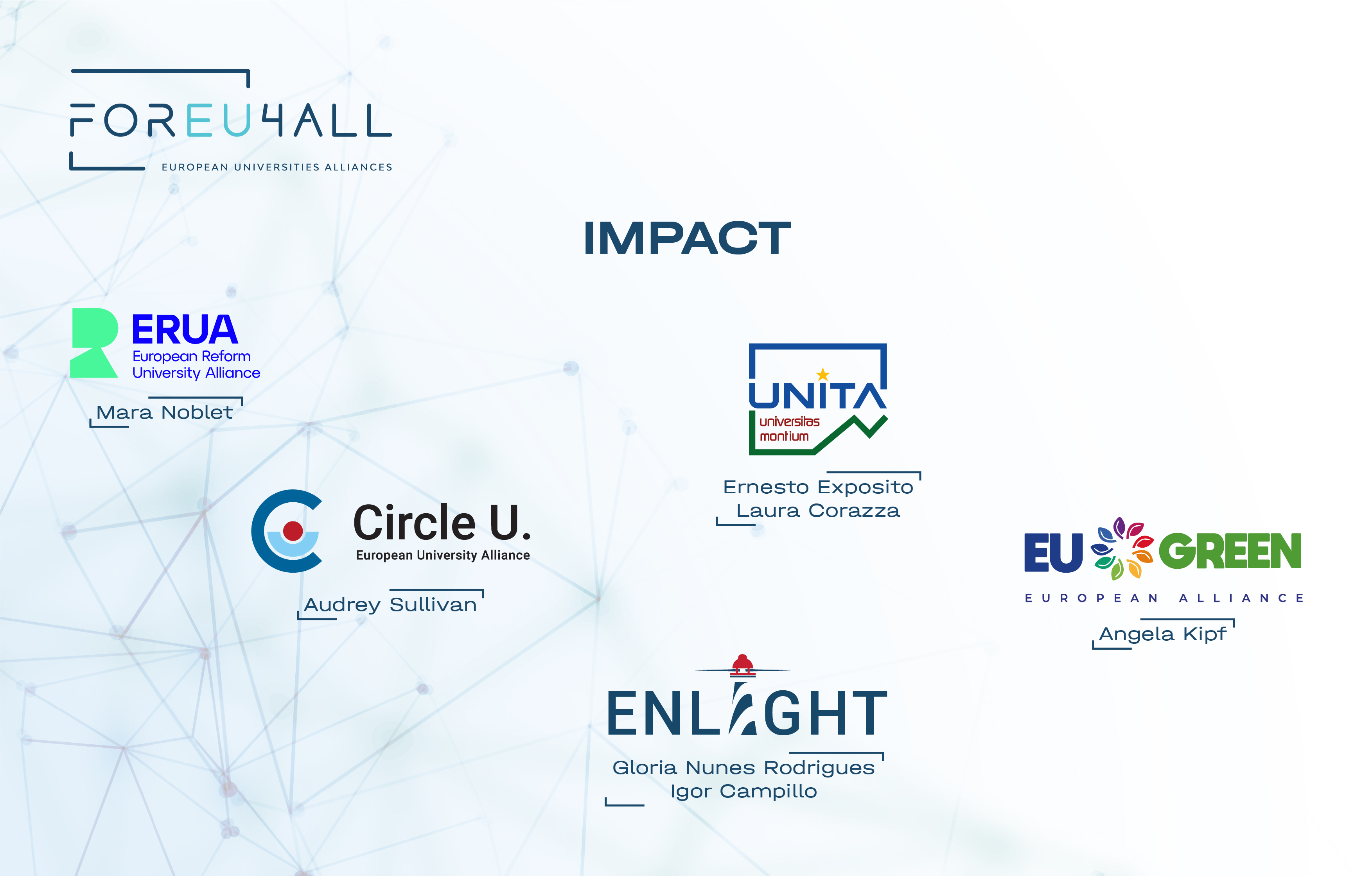 The FOREU4ALL Impact topical group aims to promote a culture of impact across the European Higher Education and Research Areas. It supports European University Alliances (EUAs) in understanding, assessing, communicating, and managing the transformative effects of their work. By raising impact awareness, enhancing impact literacy, and fostering impact readiness, the group empowers Alliance members to reflect on and deepen their contributions to the European Higher Education and society.