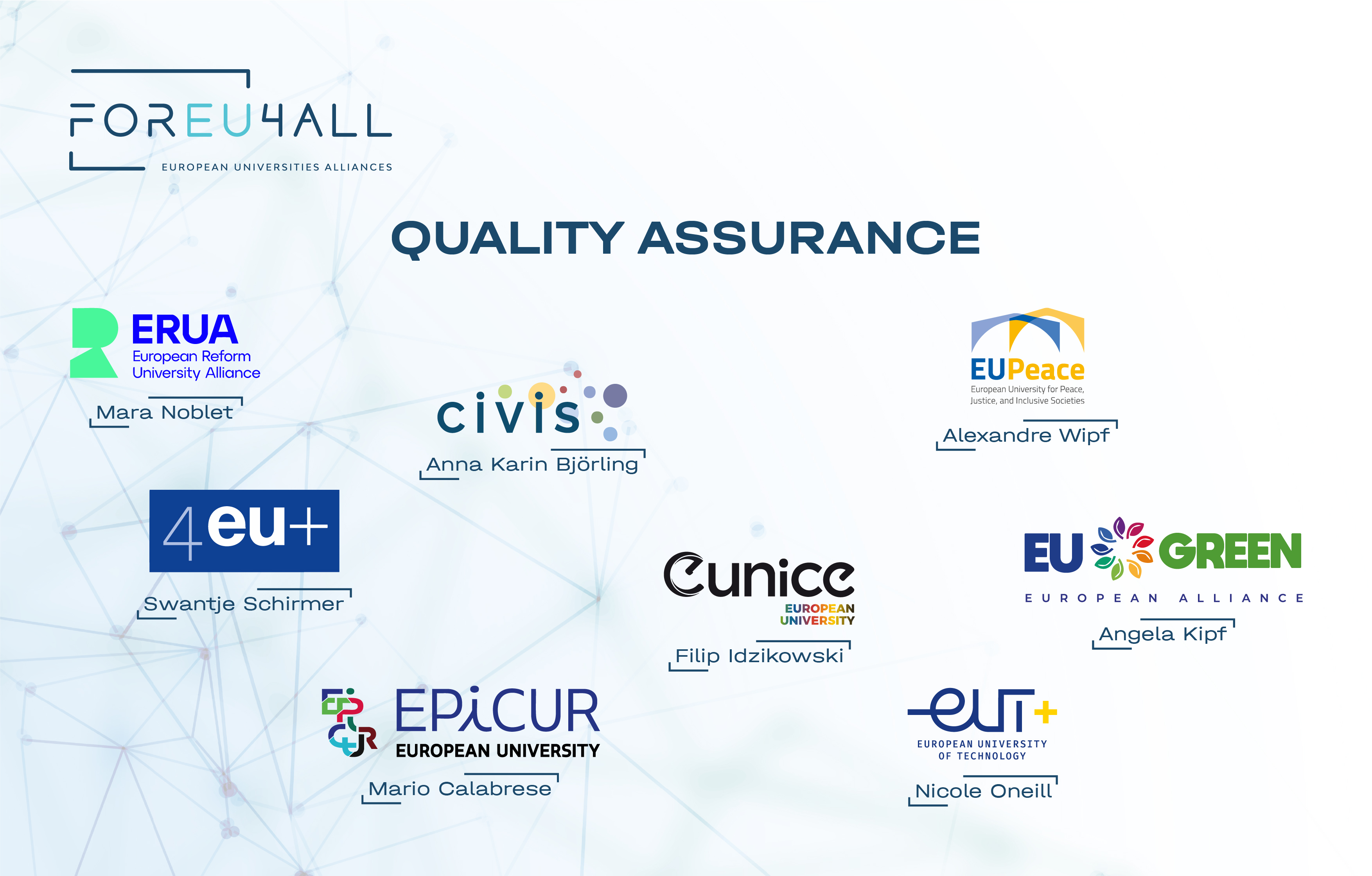 - Contribute to ongoing and future political developments and provide informed perspectives to influence European Higher Education policies in general and QA policy-making in particular, ensuring that QA practices are aligned with the evolving needs of alliances and other Higher Education Institutions (HEIs), including but not limited to the European Commission's European Degree Package and the ESG review planned for 2027.